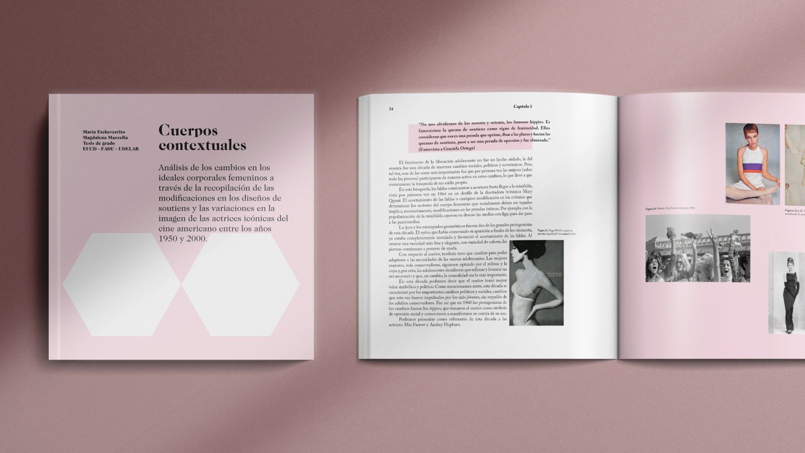 La investigación Cuerpos Contextuales es el trabajo de grado de Diseño industrial opción Textil de María Etcheverrito (@merietcheverrito) y Magdalena Mazzella (@maguimazzella). Ellas acudieron a nosotros para el diseño editorial de este trabajo, un proyecto que analiza los cambios en los ideales corporales femeninos a partir de las modificaciones en el diseño de soutiens. Se trabajó en el diseño editorial de la publicación, elección de tipografías y colores acorde al enfoque de la investigación. Para las portadillas se trabajó en la síntesis formal de los diferentes soutiens y sus formas a lo largo de los años de estudio.