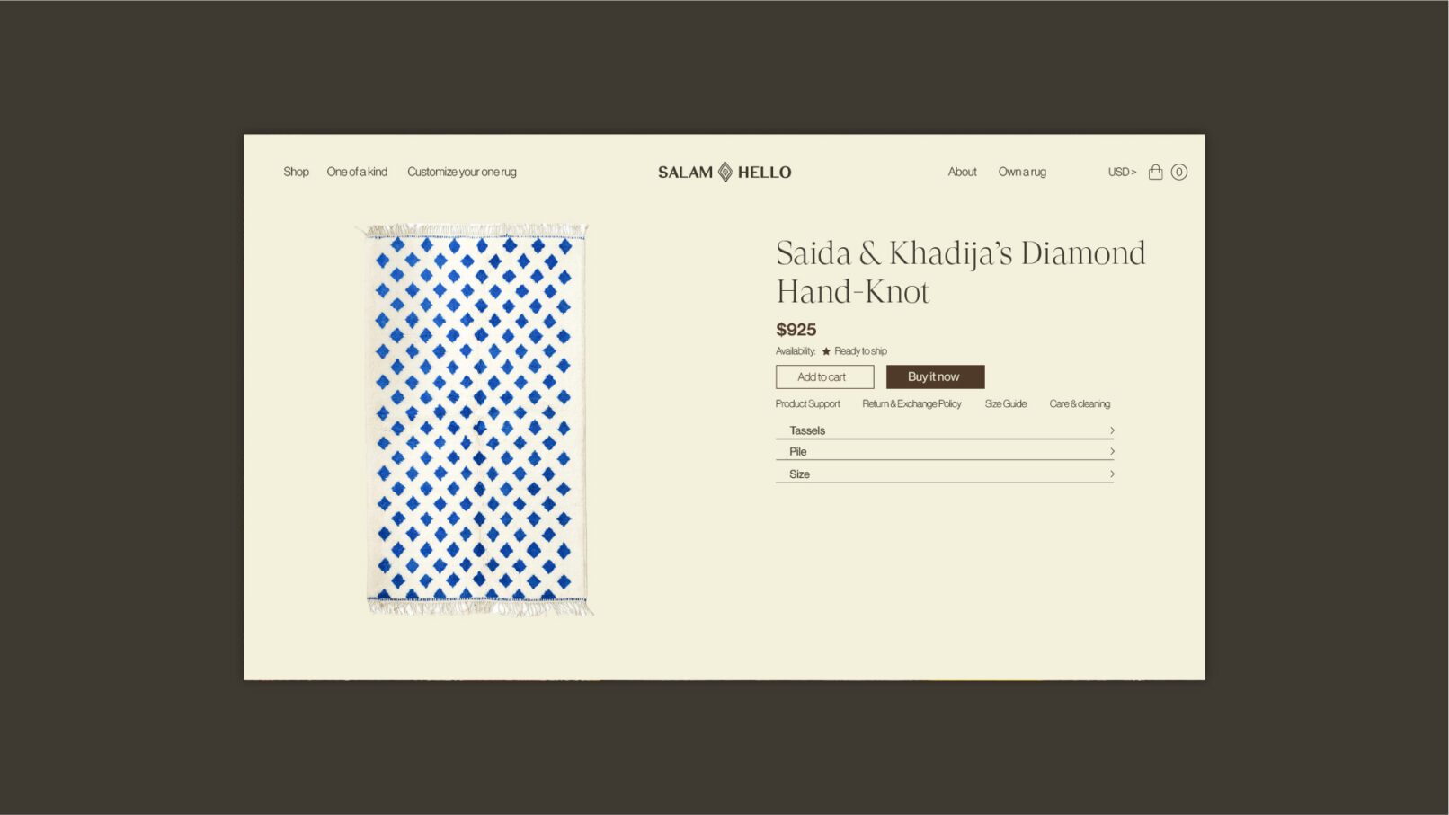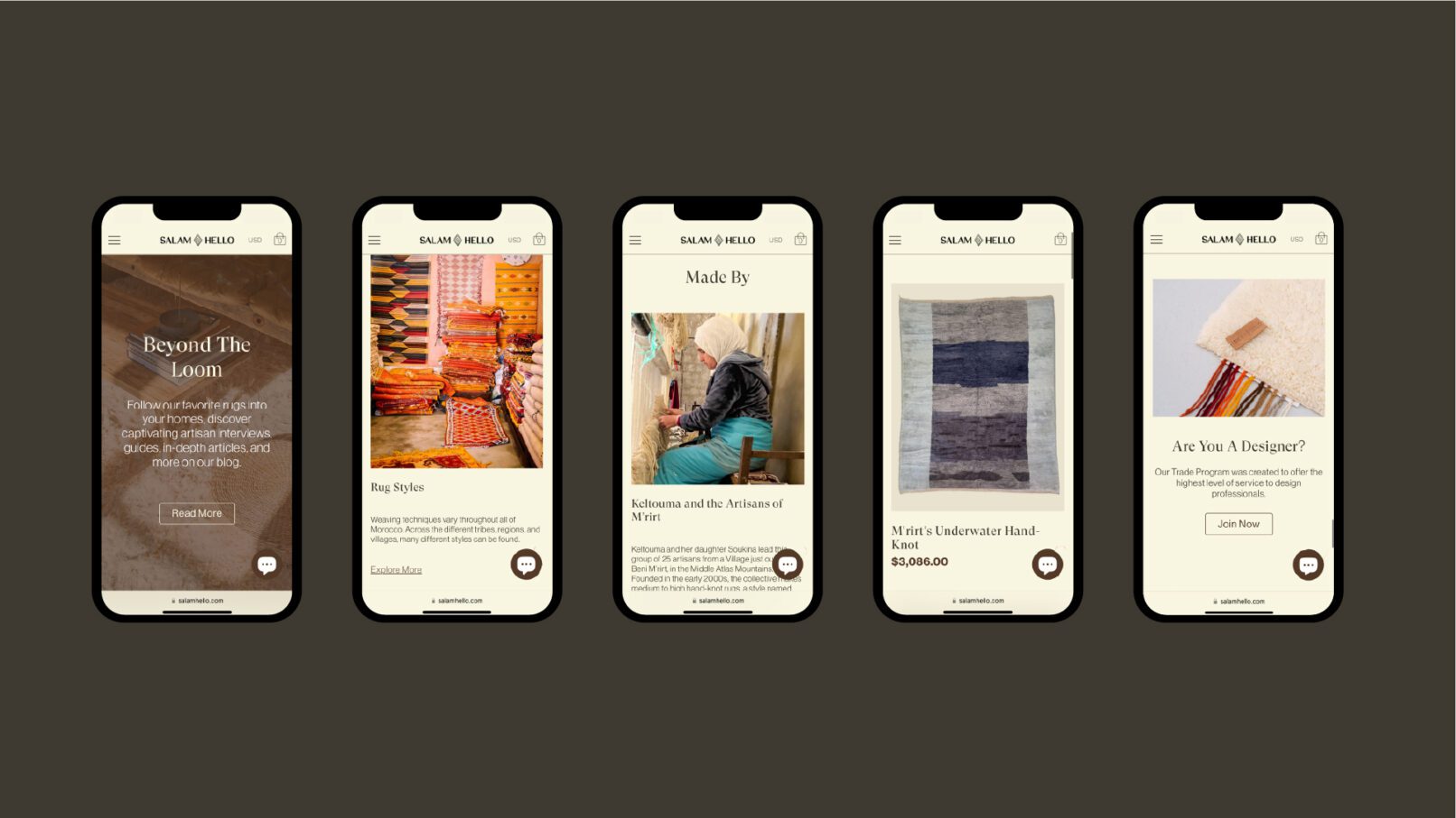 El desarrollo de su sitio debió seguir una lógica de diseño de mobile first ya que el 60% de la navegación del sitio se daba en estos dispositivos. El desafío está en cómo captar la riqueza de estos productos en una pantalla de pocas pulgadas. A la vez que ofrecer una experiencia de navegación y compra eficaz. Una experiencia que ayude a una inmersión en la propuesta de Salam Hello sin resultar abrumadora.