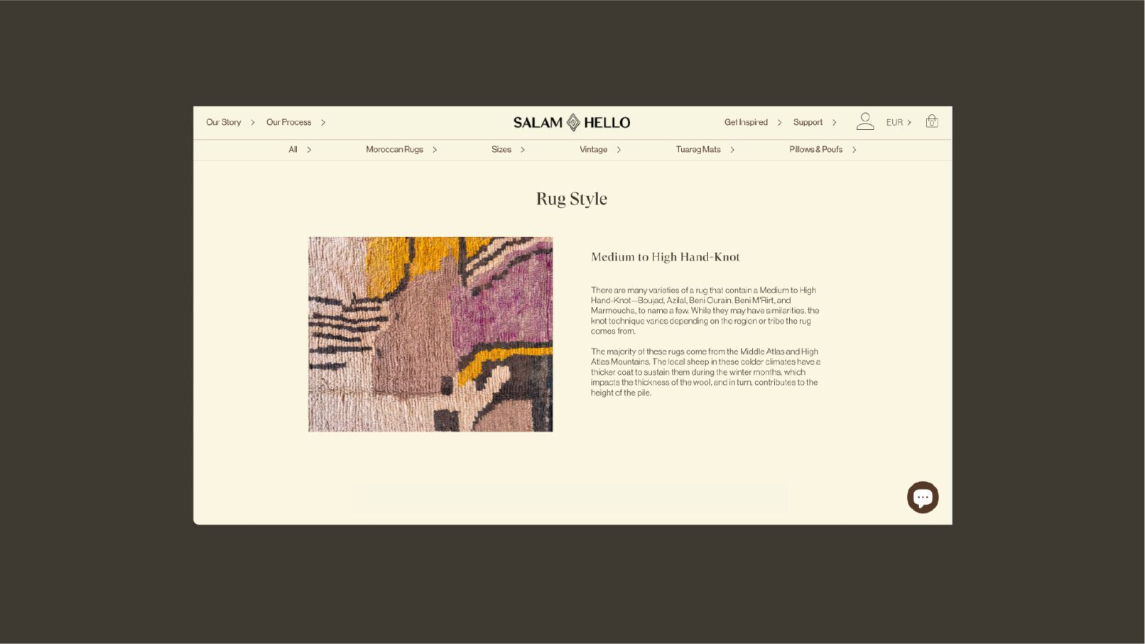 Junto a OM.LAB nos propusimos desarrollar una relación emocional con el objeto y su historia. Promover e invitar a que los usuarios conocieran más sobre la cultura amazigh el valor patrimonial de las alfombras, sus símbolos, sus métodos de producción y las personas que están detrás. Pero al mismo tiempo acercar el producto al contexto del consumidor. Considerando que se trata de personas occidentales especialmente del mercado norteamericano debíamos estimular su imaginación, habilitar a pensar estos productos en sus espacios.