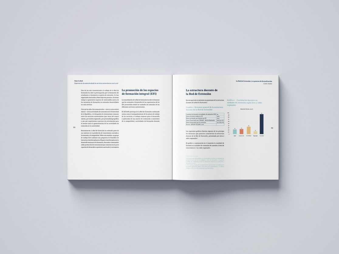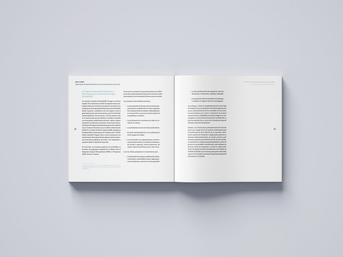 Se trabajó en la conceptualización de lo que la Red fomenta y busca evidenciar en esta publicación, el entramado generado por los diferentes Centros y Facultades dentro de Udelar fueron el punto de partida para la realización de la textura en papeles. Se buscó una lectura ágil, distinguiendo los capítulos por los diferentes sectores involucrados y las áreas de enseñanza.